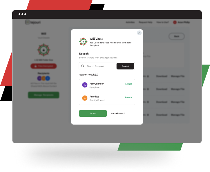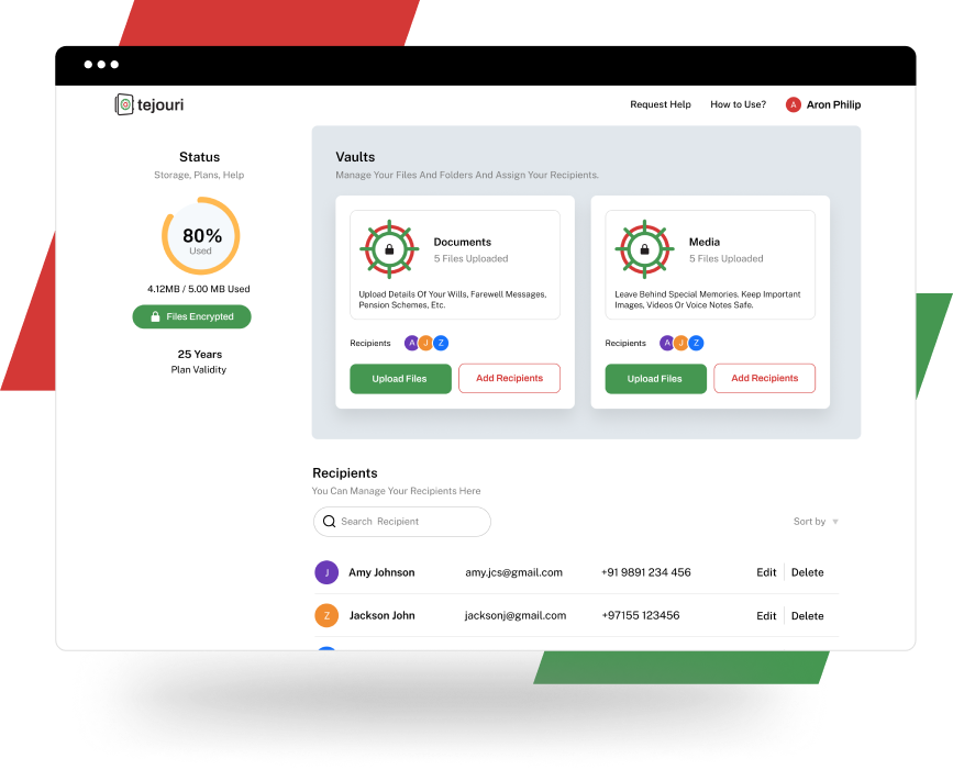As the new and innovative platform designed to securely store and pass on digital documents at the right time, tejouri is where advanced technology meets the highest standards of security regulations. Using multiple factors of authentication, encrypted data, personalised biometric information and safe-keeping ledgers, tejouri ensures that the information you choose to pass on to your loved ones is stored with utmost privacy. tejouri provides a unique platform that functions simultaneously as a cloud vault and an online safe for your data, supported by a state-of-the-art onsite DIFC data centre and a secondary UAE-based backup data centre.